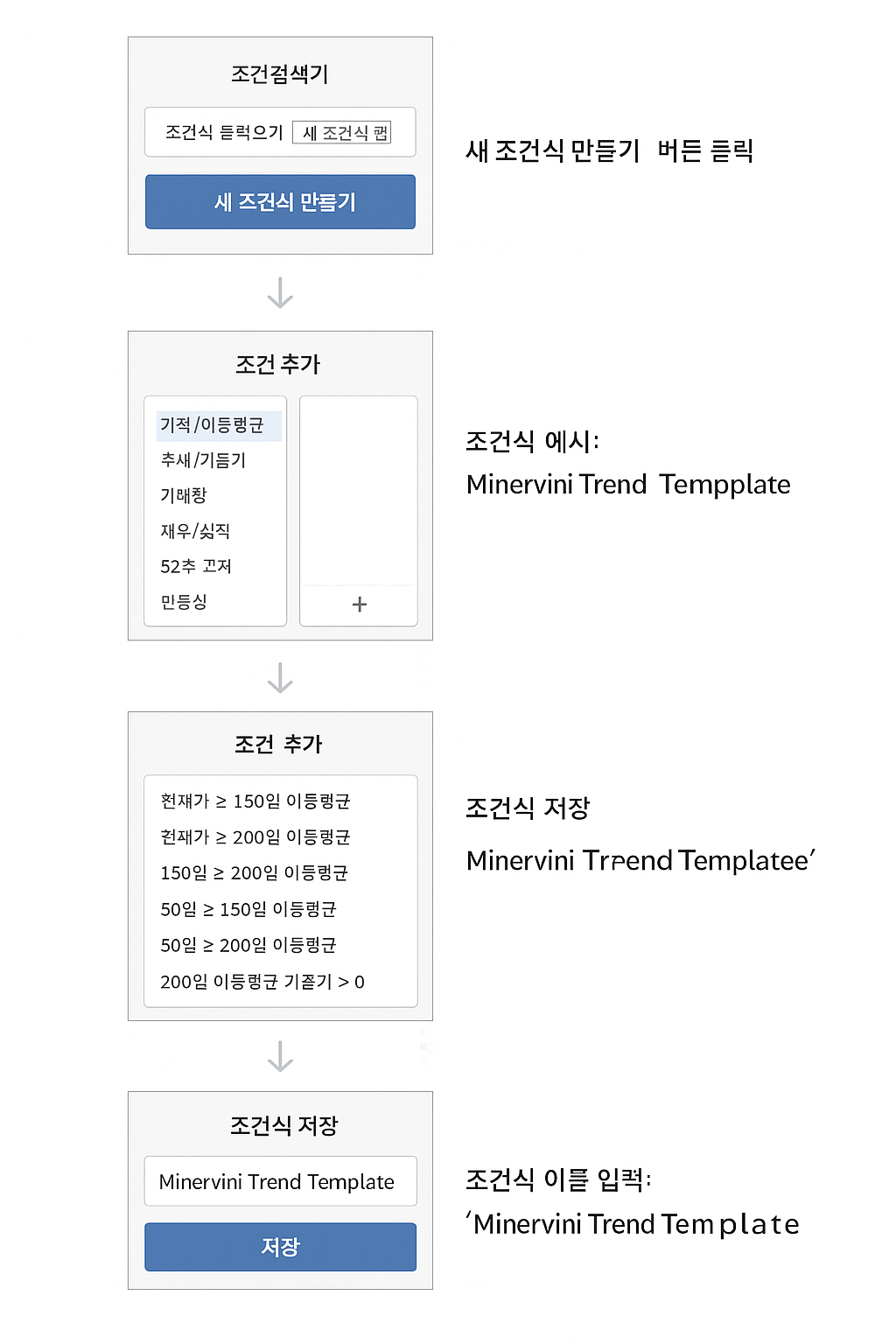 ───────────────────────────── [영웅문 HTS 메인 화면] 메뉴바 → [조건검색(0121)] 클릭 ───────────────────────────── ↓ ───────────────────────────── [조건검색기 창 열림] ┌─────────────────────────┐ │ [조건식 관리] [조건식 불러오기] │ │ [새 조건식 만들기] 버튼 클릭 │ └─────────────────────────┘ ───────────────────────────── ↓ ───────────────────────────── [조건 추가 창] - 좌측: 조건 분류 메뉴 ▸ 가격/이동평균 ▸ 추세/기울기 ▸ 거래량 ▸ 재무/실적 ▸ 52주 고저 ▸ 변동성 - 중앙: 선택된 조건식 목록 - 우측: 조건 세부 값 입력 ───────────────────────────── ↓ ───────────────────────────── [조건식 예시: Minervini Template] 1) 현재가 ≥ 150일 이동평균 2) 현재가 ≥ 200일 이동평균 3) 150일 ≥ 200일 이동평균 4) 50일 ≥ 150일 이동평균 5) 50일 ≥ 200일 이동평균 6) 200일 이동평균 기울기 > 0 ───────────────────────────── ↓ ───────────────────────────── [조건식 저장] - 조건식 이름 입력: "Minervini Trend Template" - [저장] 버튼 클릭 ───────────────────────────── ↓ ───────────────────────────── [실시간 조건검색 실행] 메뉴 → [조건검색(0124)] 저장한 조건식 불러오기 ▶ 해당 조건 만족 종목 리스트 실시간 출력