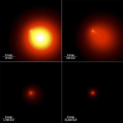 반면에 새로운 감마선 후광 모델은 에너지 레벨에 따라 방출이 어떻게 변하는지 보여준다. 게밍가의 후광은 10 GeV 영역일 때 가장 컸지만, 높은 에너지 영역에서는 후광이 더 작아진다. 그 이유는 저에너지 입자일수록 별빛과 상호 작용하여 감마선으로 바뀌기 전에 펄서로부터 훨씬 더 멀리 이동하기 때문이다. 후광의 크기만으로 단순 계산할 수 없다는 뜻이다.